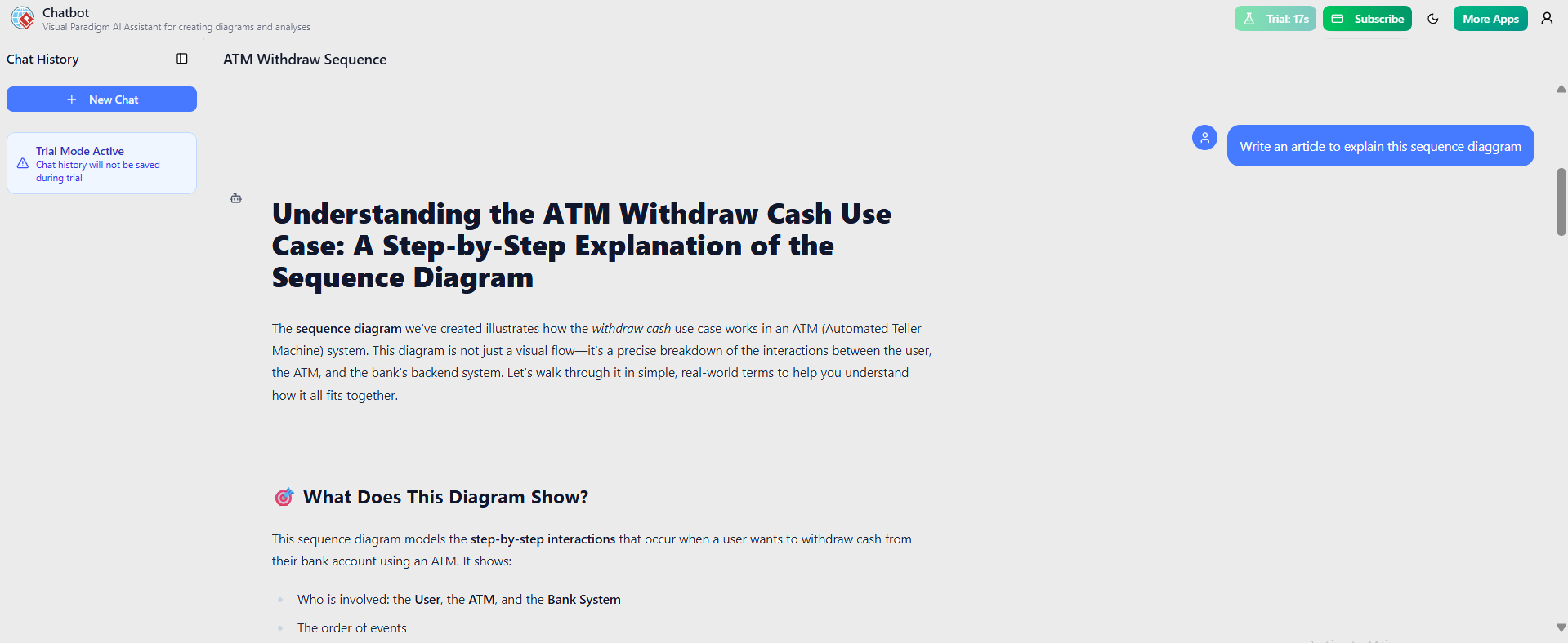 The Visual Paradigm AI Chatbot was employed in a trial mode session titled “ATM Withdraw Sequence.” The user interacted with the chatbot through simple text prompts, demonstrating its core capabilities. Below is a step-by-step breakdown of the implementation, based on the session transcripts and outputs.