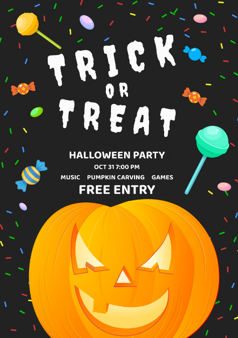 This is a Halloween Party Poster, you can try to use this poster to help you invite your friend. This poster has a black color tone, a Halloween and sweet illustrations, and some textbox to give you enter your information