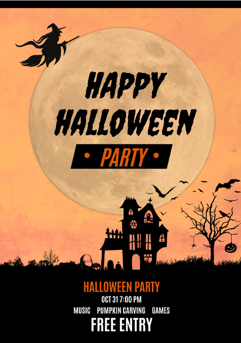 This is a Halloween Party Poster with a beautiful moon photo, it has an orange color tone, some Halloween illustrations, and some textbox to give you enter your Halloween information.