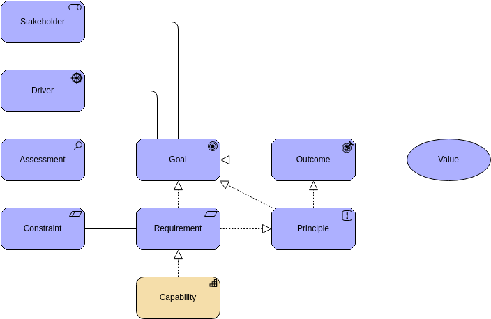This motivation view can be used to examine the motivations, or causes, that drive an organization’s design or transformation, as well as its enterprise architecture, which serves as the foundation for all change operations and business transformations within a company. This view depicts the development effort’s vision, whether the scale and scope encompass the entire organization, a subset of it (e.g., a line of business), or a particular program or project (solution level). Note that a value can be added to any ArchiMate element, such as the outcome (or any other ArchiMate element), to show what the real value add is.
