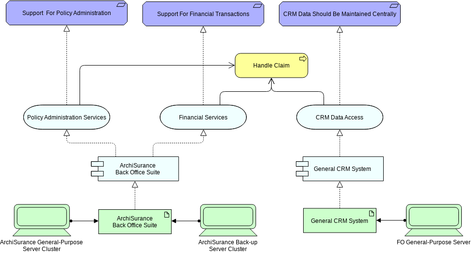The figure below shows an ArchiMate diagram drawn under the Requirements Realization Viewpoint.