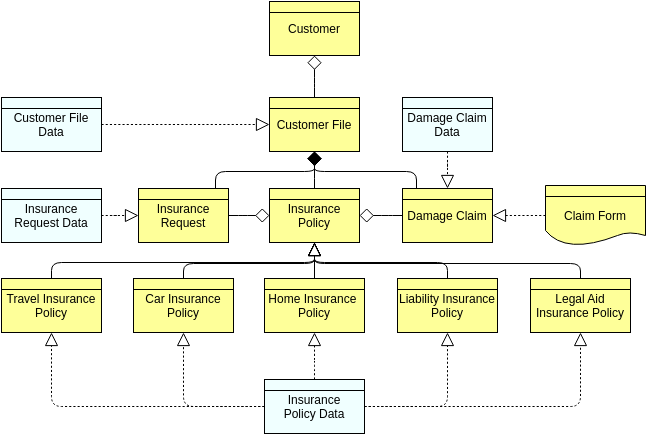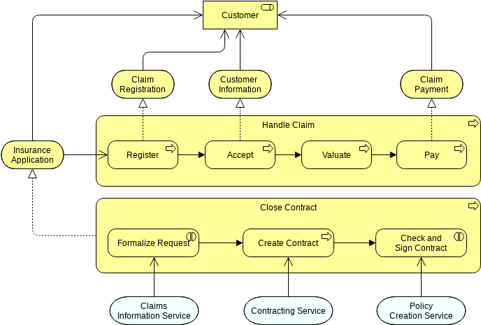 | Elements | Business actor, Business role, Business collaboration, Business process/function/interaction, Business event, Business object, Application component/collaboration, Application interface, Application process/function/interaction, Application event, Application service, Data object |