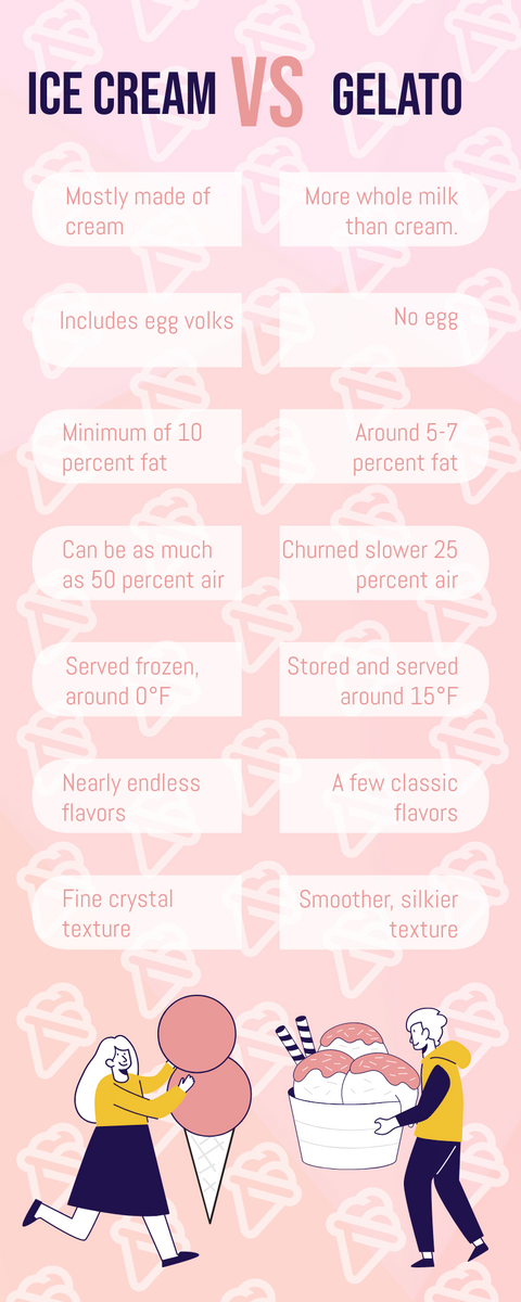Are you a fan of frozen desserts but don’t know the difference between gelato and ice cream? Our “Gelato vs. Ice Cream Infographic” is here to help! This eye-catching infographic breaks down the key differences between these two popular desserts, from their ingredients to their texture and serving temperatures. With vibrant colors and playful illustrations, this infographic is sure to catch the eye of anyone craving a sweet treat.