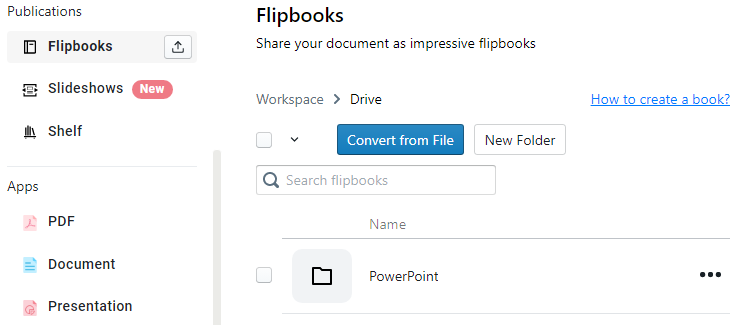 Select Convert from File under Flipbooks, you can then upload our work to the page.