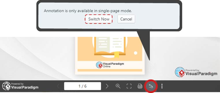 In our Flipbook / Slideshow reader, we can find the Annotation button on the toolbar. Annotations are only available in single-page mode, otherwise you will be prompted to switch.