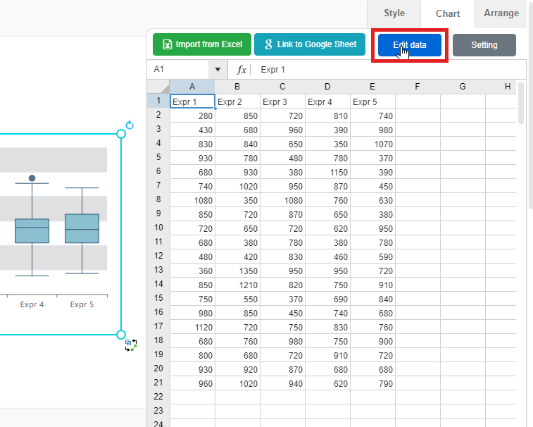After that, you can now input the data for the chart. You can first click on the “Edit data” button on the right-hand side of the window. A window of data editing will then appear and you can now fill the data on the spreadsheet. You may import the data from Excel or link to Google Sheets too.