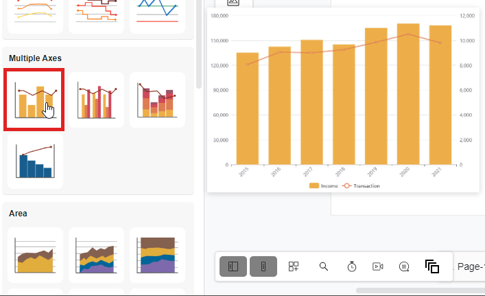 After clicking the “Chart” icon, you are now available to select a chart that you want to create. Take a column and line chart as an example, if you want to create an area chart, you can just simply drag out the icon of the a column and line chart. Then drop it on the design canvas. An area chart will then appear on your canvas.