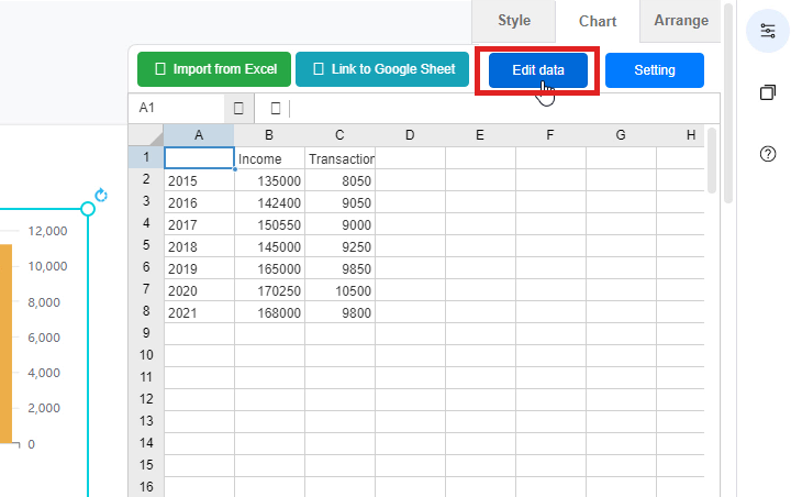 After that, you can now input the data for the chart. You can first click on the “Edit data” button on the right-hand side of the window. A window of data editing will then appear and you can now fill the data on the spreadsheet. You may import the data from Excel or link to Google Sheets too.