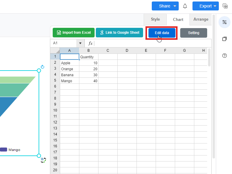 After that, you can now input the data for the chart. You can first click on the “Edit data” button on the right-hand side of the window. A window of data editing will then appear and you can now fill the data on the spreadsheet. You may import the data from Excel or link to Google Sheets too.