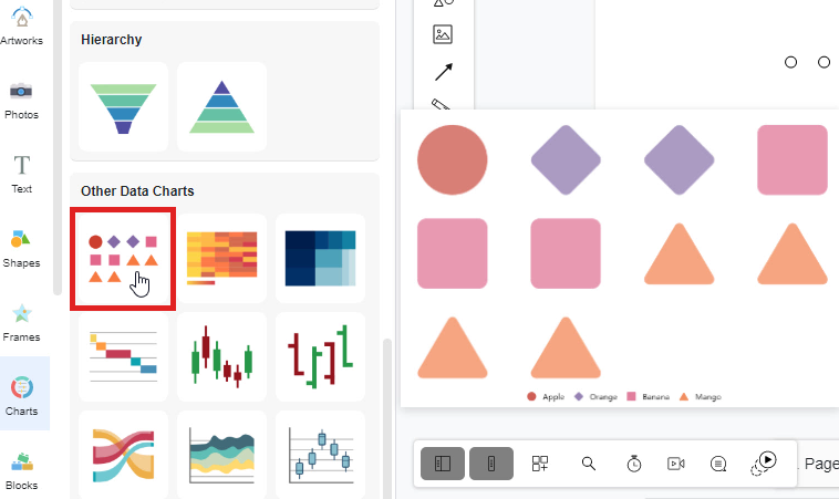 To create a chart on Visual Paradigm Online, you can first click on the “Charts” icon on the left-hand side of the palette bar.