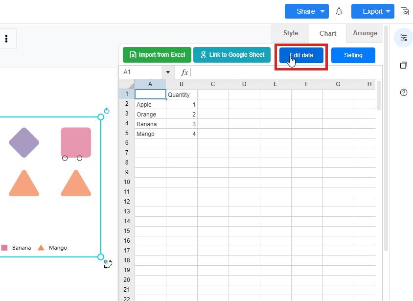 After that, you can now input the data for the chart. You can first click on the “Edit data” button on the right-hand side of the window. A window of data editing will then appear and you can now fill the data on the spreadsheet. You may import the data from Excel or link to Google Sheets too.