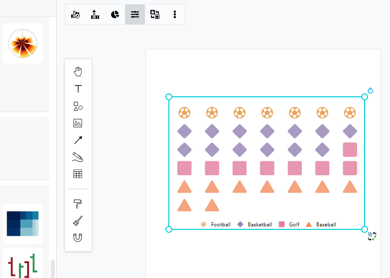 After clicking the “Chart” icon, you are now available to select a chart that you want to create. Take the pictorial chart as an example, if you want to create a pictorial chart, you can just simply drag out the icon of the pictorial chart. Then drop it on the design canvas. An area chart will then appear on your canvas.