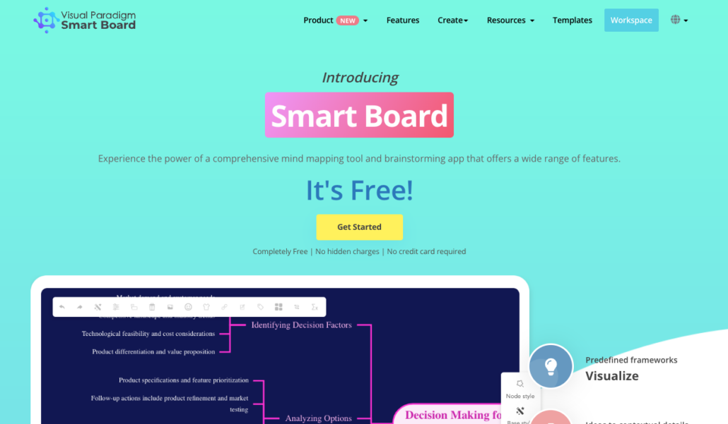 Visual Paradigm Smart Board is an intuitive and robust tool for mind mapping, designed to assist individuals and teams in capturing, organizing, and visualizing their ideas in a dynamic and user-friendly manner. With its collaborative and interactive features, Smart Board provides a virtual canvas that facilitates seamless brainstorming, project planning, and creative solution generation.