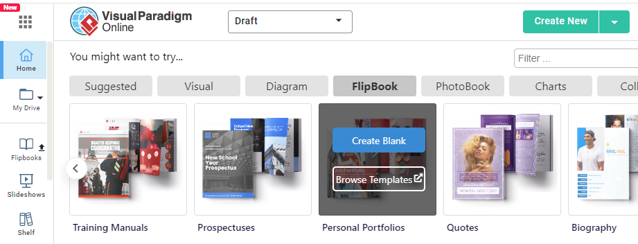 In your workspace, you can choose to start from scratch, or browse the templates under Home > Flipbook > Personal Portfolios. You can also directly visit the template library: https://www.fliplify.com/templates