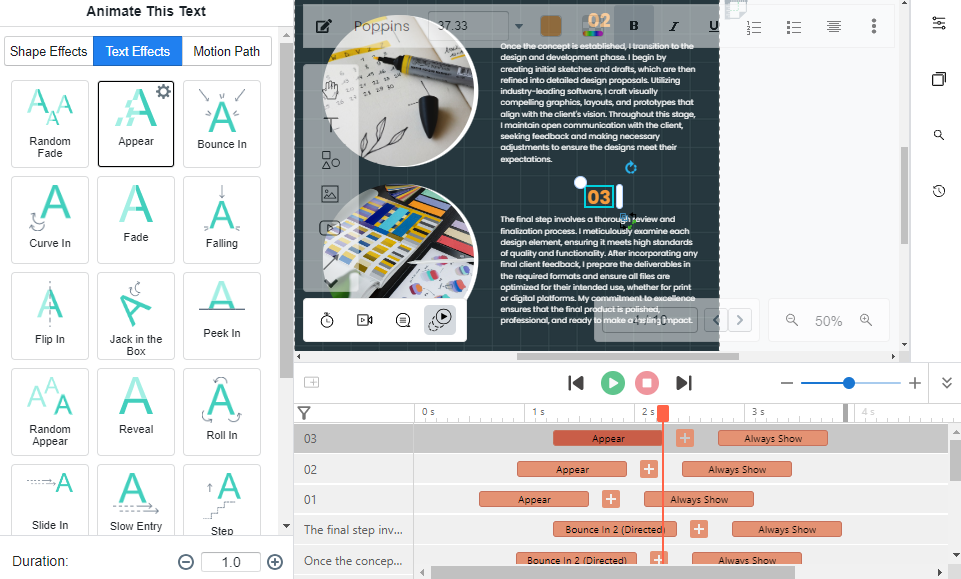 In order to make your flipbook more attractive, you can add animation to the animations on the page. Open the animation timeline by the button below, we can then see the bars representing the the enter and exit animation. For text, there is also a Text Effect tab other than Shape Effects and Motion Path.