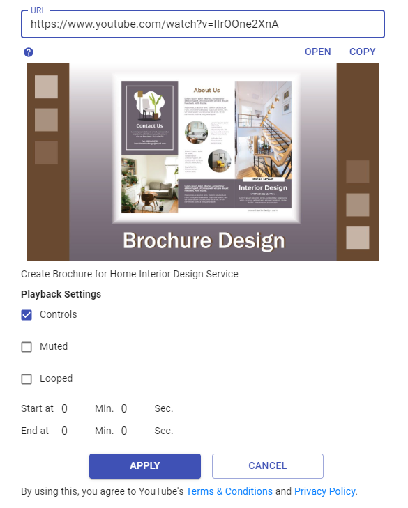 Other than images, we can also embed video to the flipbook. Click the Video button and enter the URL of your video, we can then embed the video to our work portfolio. We can also adjust the playback setting according to our needs.