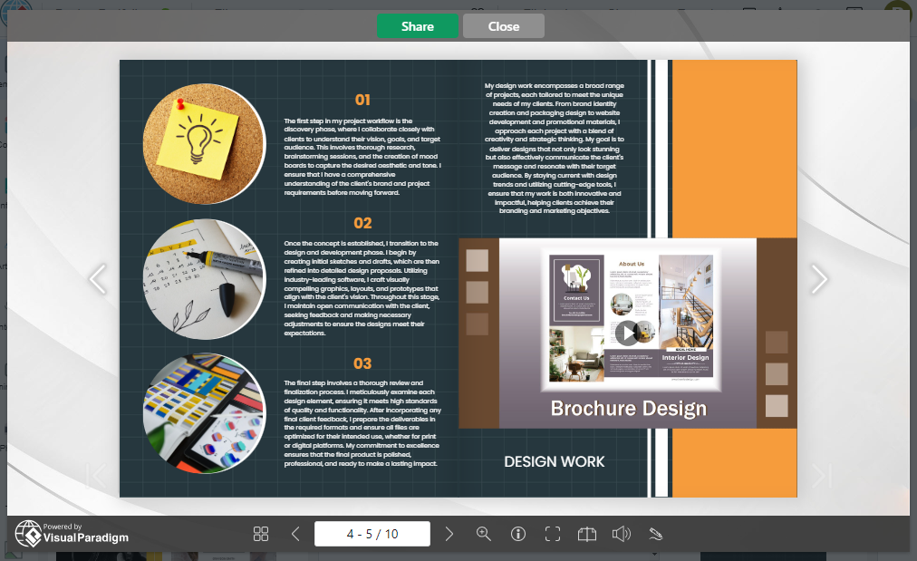 When finish, select Flipbook > Preview Flipbook. We can preview the portfolio as a flipbook here. We can also preview the video and try different interaction with it. After checking is done, click Share to publish the Flipbook. We can then share our work portfolio with URL, and also share on different social media.