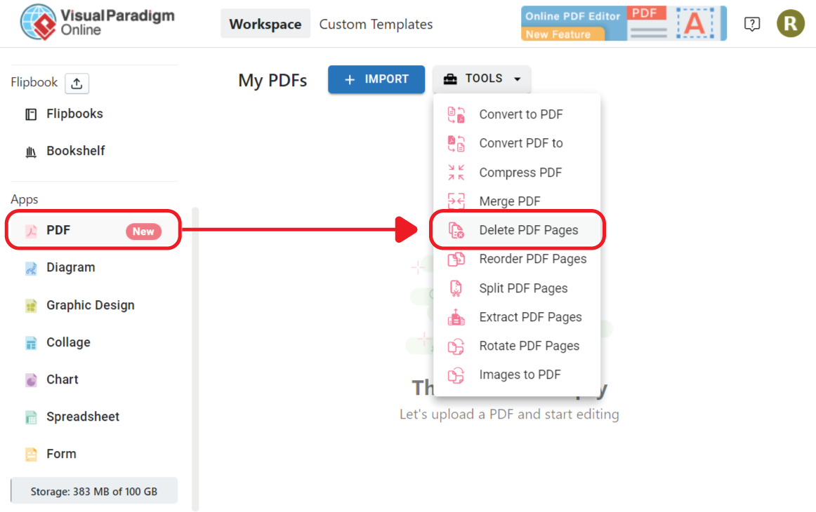 In our workspace, click Apps-PDF, then choose Delete PDF Pages under Tools.