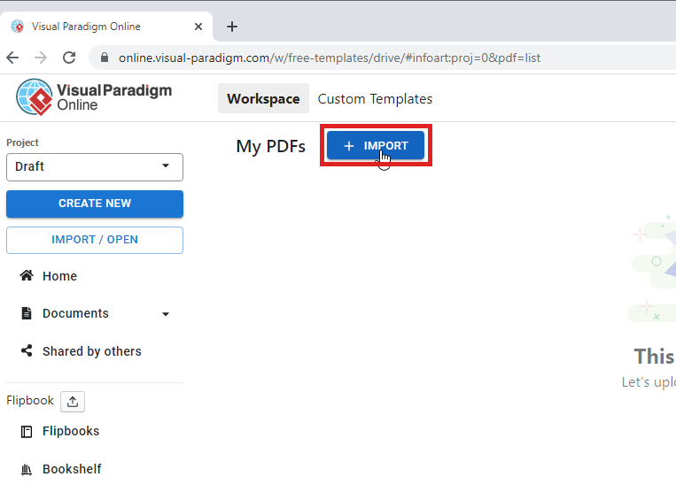 Firstly, After login into your Visual Paradigm Online, you will arrive at your workspace in VP Online. You can now go to Dashboard and select Apps-PDF. Then, you can click on the import button to import your PDF from your device.