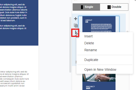 The other way to duplicate your design page is that click on the ellipse button on the right-hand side of your page. Firstly, you can simply click on the ellipse button (with three black dots) on the left-hand side of the page you want to duplicate. A list of “insert, delete, rename, duplicate and open in new window” will appear. If you want to duplicate this page, you can just click on “duplicate” for coping with the page you selected. The selected page will then be atomically duplicated.