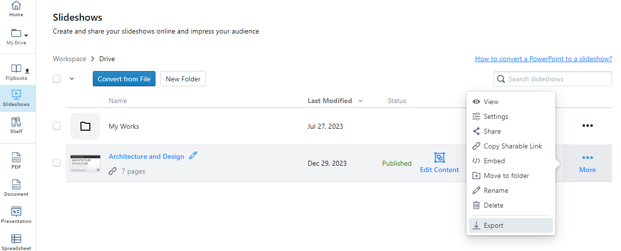 Click Export under More. We can then get a zipped folder, which is our Slideshow.