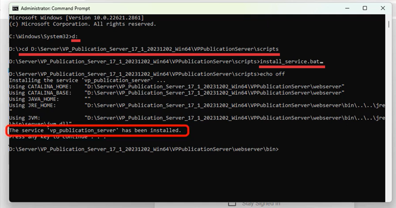 When you see the message The service vp publication server had been installed, means the service being successfully setup.