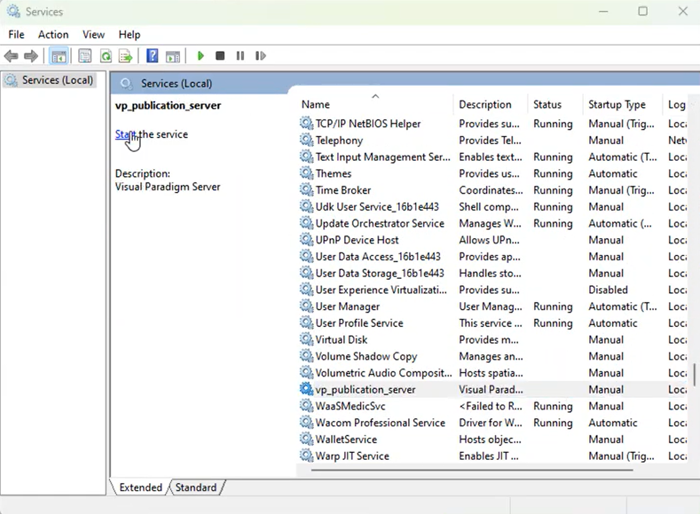 After that, go to System Service with administrator right to locate the vp publication server service. Press the start button to start it up