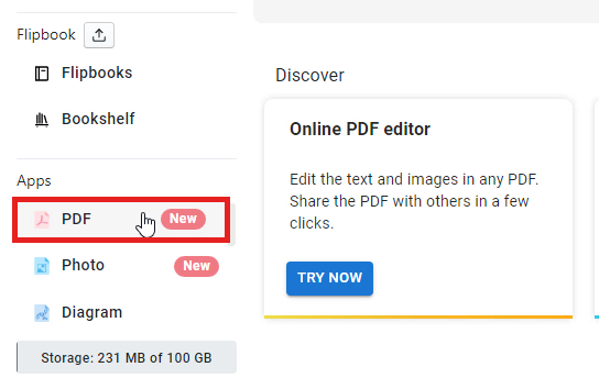 After login into your Visual Paradigm Online, you will arrive at your workspace in VP Online. You can now go to Dashboard and select Apps-PDF. Then, you can click on the PDF button to import your PDF from your device.