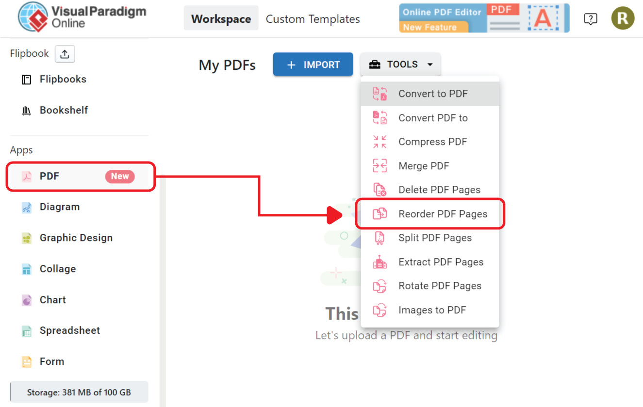 After login our workspace, we can go to Apps-PDF, then click Reorder PDF Pages under Tools.