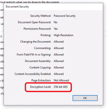 4 – When checking the property of the PDF, we can see that the Encryption Level is the same as our setting.