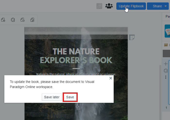 After finishing making changes to your flipbook, you can then click on the “Update flipbook” button in the upper right corner of your page for updating your design on Visual Paradigm Online. After clicking the “Update flipbook” button, you can click the “Save” button for saving the document to the Visual Paradigm Online workspace. Afterward, your designed flipbook will be automatically updated and there is no need to republish the book again.