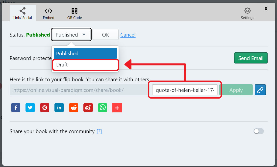 Copy the URL of your Flipbook, then set your work as Draft state.
