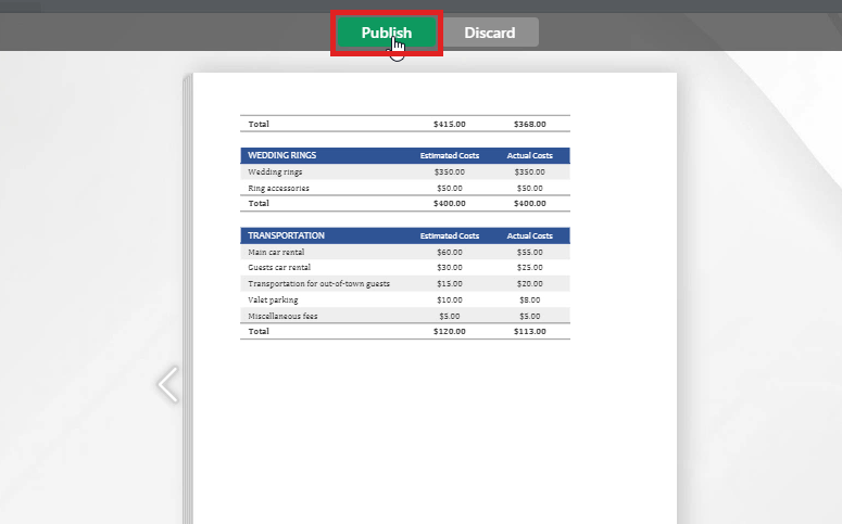 The excel file you selected will then be converted into flipbooks, you can now preview the whole document by flipping each of the pages and have a check of each page. After that, you can then click on the “publish” button for publishing your document as a flipbook in Visual Paradigm Online.