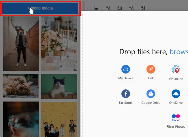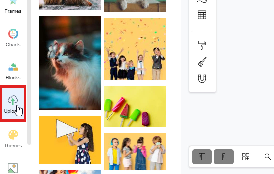 1. The first step to uploading an image is to click on the “Uploads” icon on the tool palette on the left-hand side of the window. You can simply click on the icon of “Upload” first and then click on the blue button of “Upload media” on the palette for uploading images.
