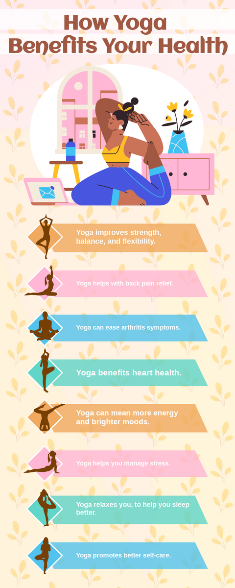 Presenting the “How Yoga Benefits Your Health Infographic” designed with Visual Paradigm Online. This infographic is designed to inform and educate individuals and organizations about the benefits of incorporating yoga into their daily routine. The design of the infographic is visually engaging, using soothing colors and clean lines to convey information effectively.