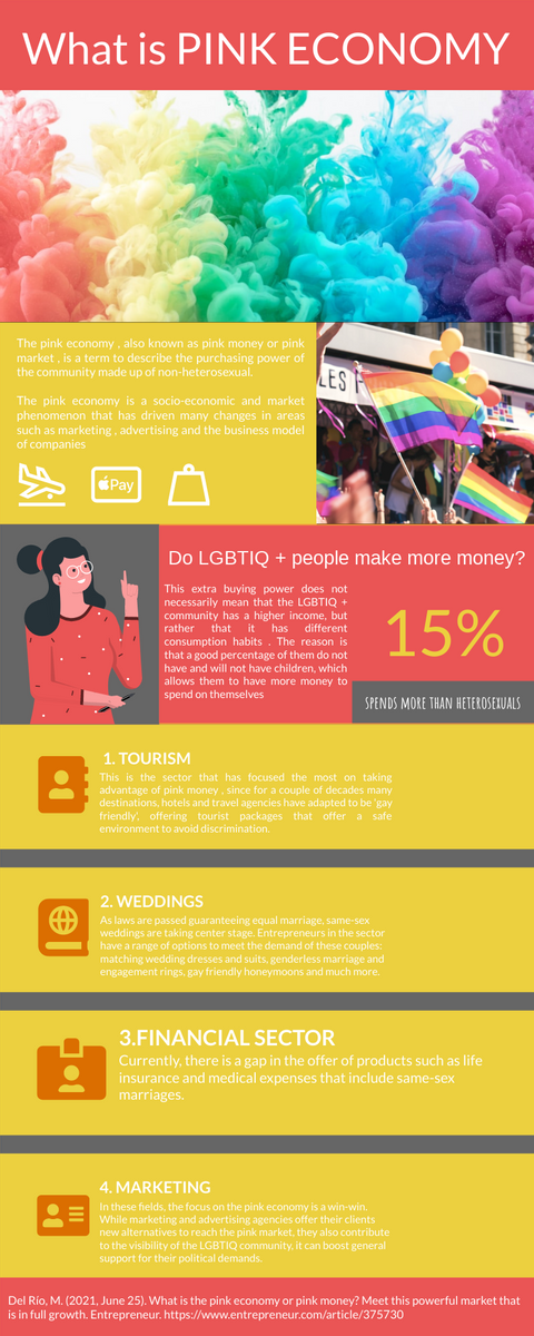 The pink economy is also referred to as the “queer economy” or the “rainbow economy” and is an important aspect of the broader concept of “diversity economics.” It is a term used to describe the economic activity generated by the LGBTQ+ community, which includes both the production and consumption of goods and services.