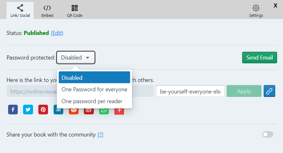The most common way to share the book to others is giving them the link of the book. However, it is not suitable for promotion and looks boring. In this case, we can choose to share it through different social media or email.