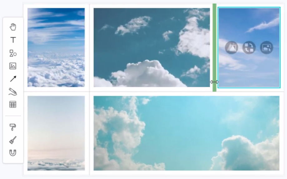 In a classic collage, cells are divided by different grids. The composition of the grid controls the size of the cells. In this case, we can manage the location of the grids to resize the cells in it.
