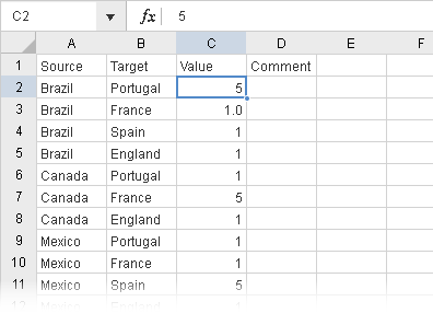 4. This will open the spreadsheet editor where you can add or edit links. Each row represents a link and the first and second columns specify the source and target of the links. The third column, “Value”, specifies the weight of the links. Edit the spreadsheet to reflect your desired links.