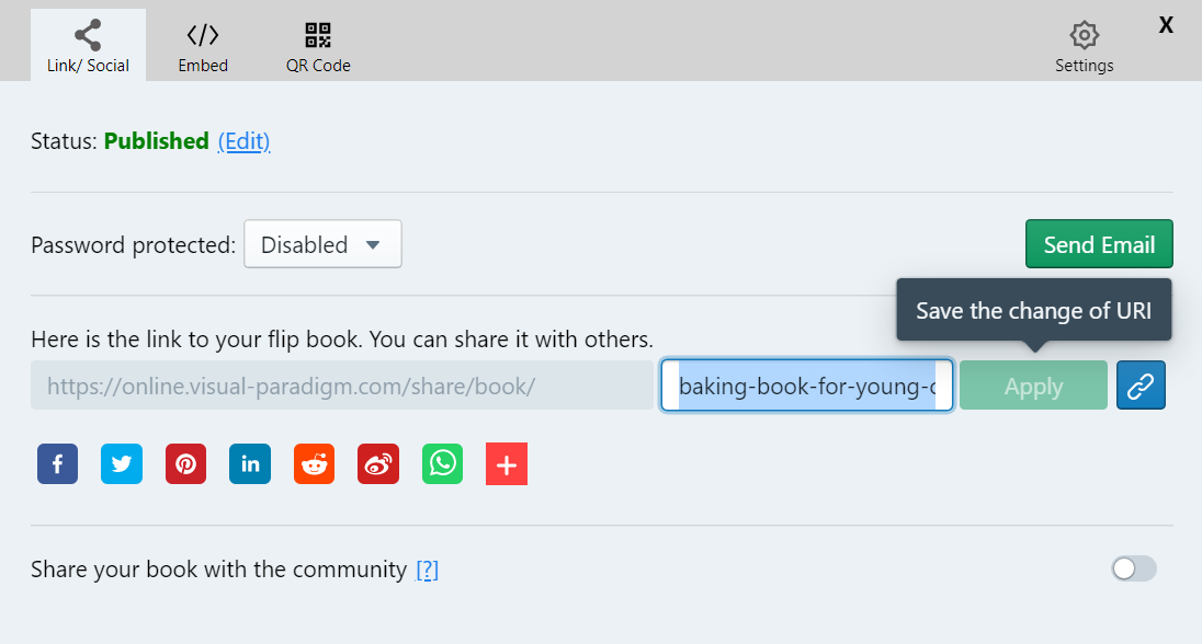 In this case, if you change the URL of the flipbook, click apply. Then, open the share browser again, you will find that the URL in the post is also changed.
