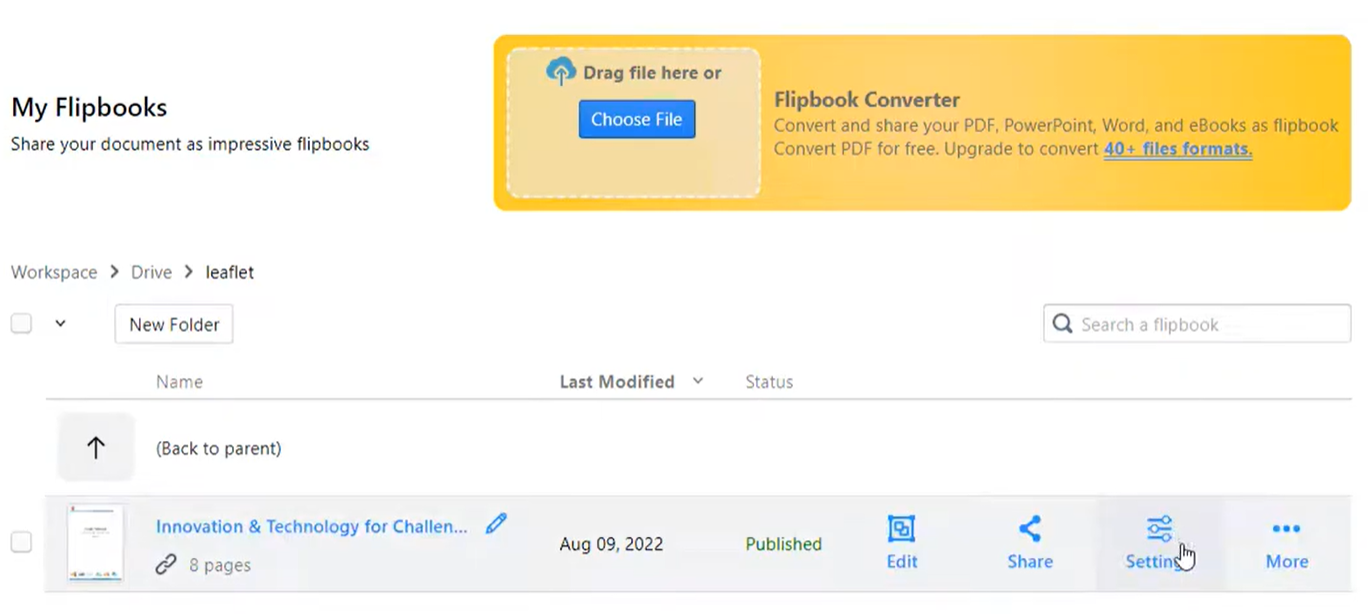 - Mouse over your flipbook that you want to specify the background and select “Settings” on your Workspace, My Flipbooks > Drive.