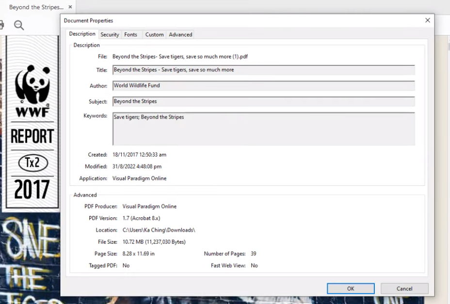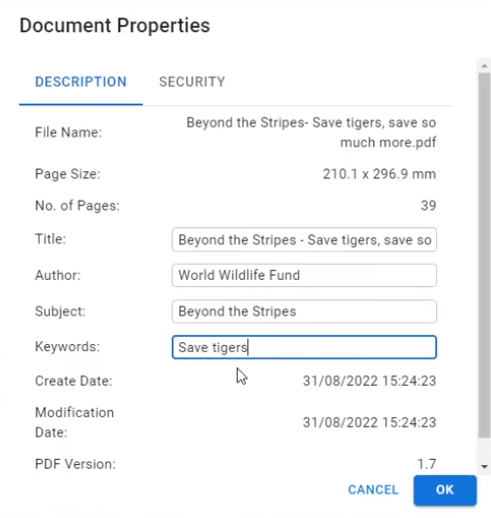 Document Properties displays basic information about the document, like title, author, subject, and keywords. You can specify the metadata of a PDF file, by using Visual Paradigm Online Free PDF Editor.