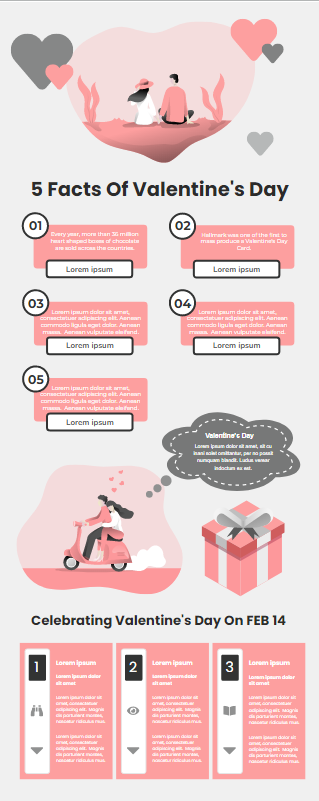 Color choice is important for infographic design, the colors you have chosen for designing your infographic have to be corporate well with the theme of the infographic. For example, if you are creating a valentines day infographic, you may consider to use bright or peachy colors like red, white, or pink. Instead of using dark shades colors, using romantic colors might be better in giving a vibe of romance and love for your infographic. You may take a look at the below infographic examples for Valentine’s Day.