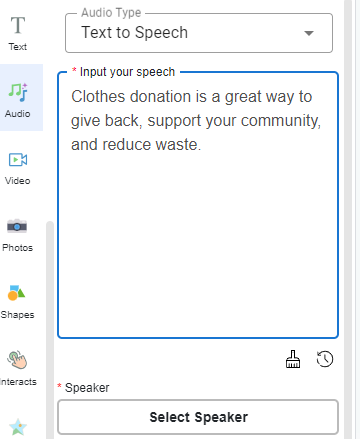 In VP Animated Explainer, select text to Speech under Audio Type. Then input your speech to the text box below. Then click Select Speaker.