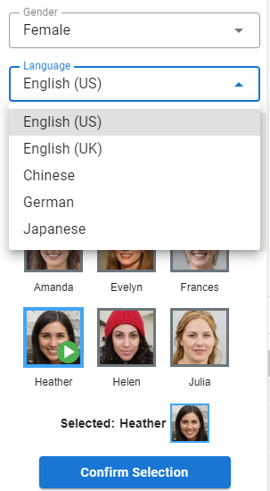 You are able to select speaker in different gender and languages. Click the play button on the speaker can preview their tone and voice. After that, click Confirm Selection button.