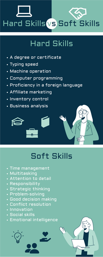 Hard skills are the technical skills and knowledge that you need to do a job. These hard skills can vary a lot depending on your field. For example, if you are a programmer, you may need to master a language (such as JavaScript), develop your logic skills, and learn to think like a computer.