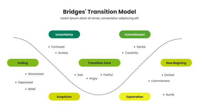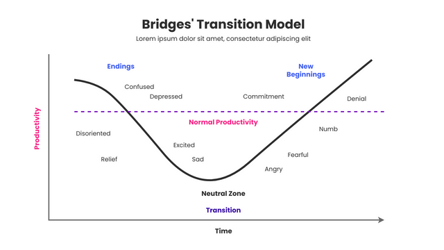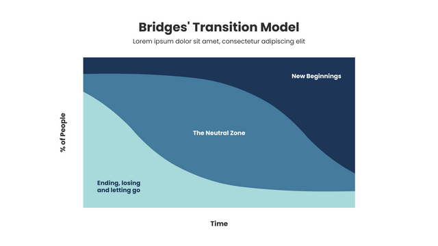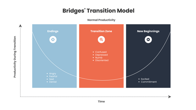 The Bridge Transition Model, which focuses on transition rather than change. The idea of focusing on transition rather than change is not only a matter of wording, but it also devises an entirely different approach to change management.