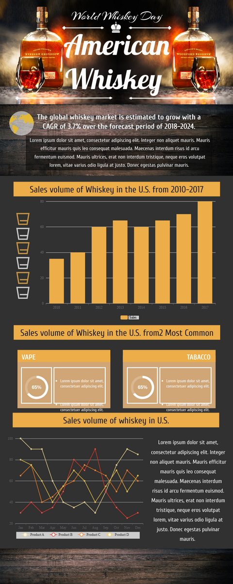 Our “Whiskey Infographic” is a stunning visual representation of the rich history and culture of whiskey. The sleek and modern design of this infographic is perfect for businesses and organizations that want to impress their audience with high-quality visuals. But did you know that you can customize this design to fit your specific needs?
