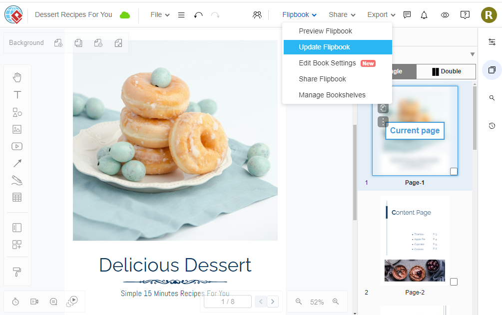In order to update the flipbook, we need to select Flipbook > Update Flipbook.